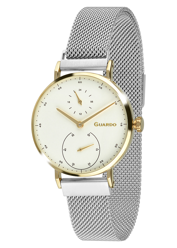 Damski zegarek Guardo 012660-2. Na bransolecie mesh. Koperta z metalu o wymiarach 34 x 42mm. Złoty kolor koperty.